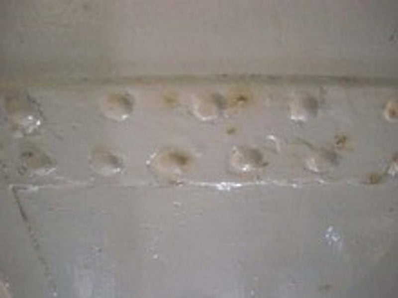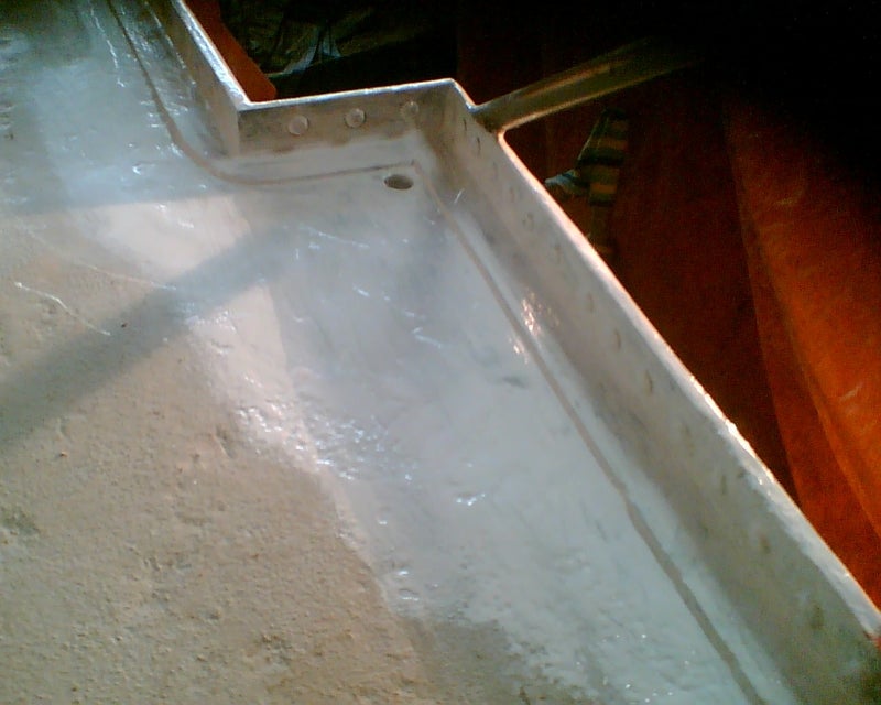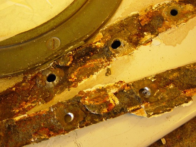 Roest in de naden naast de geklonken strippen doordat er water in blijft staan. Oplossing klinknagels uitboren, alles roestvrij maken en weer in elkaar klinken