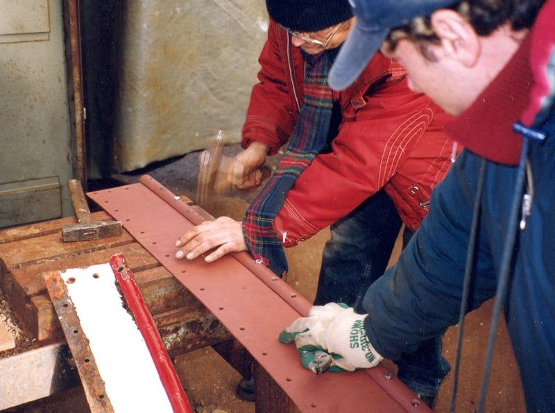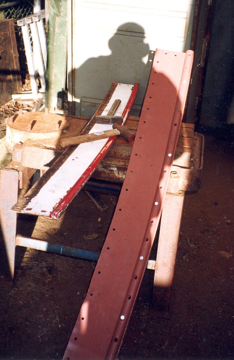Om de naad tussen patrijspoort en strip te vermijden een bochtje in de strip gemaakt. Eerst met boutjes vastzetten voor het klinken