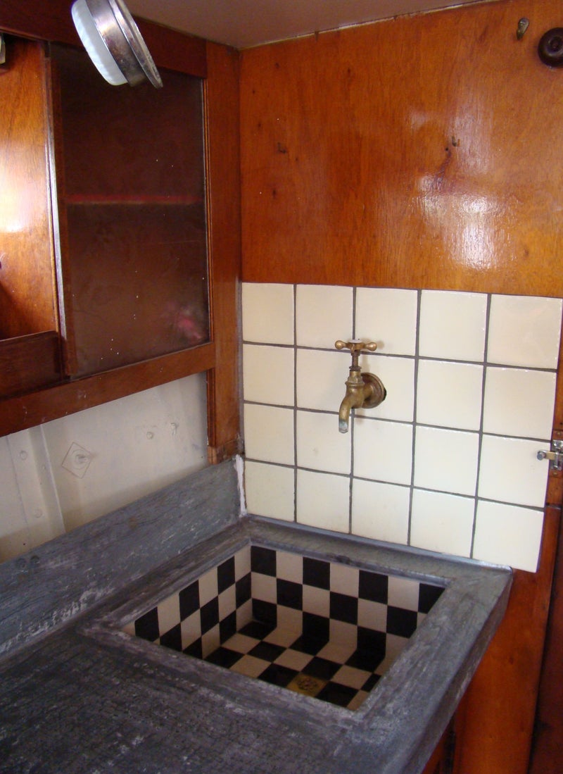Plek onder het aanrecht, de donkere buis is de waterafvoer.